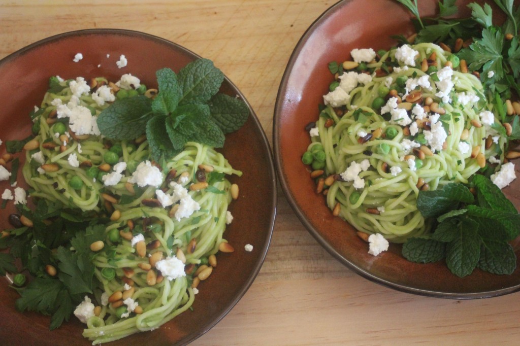 Green pea pasta with fetta and fresh herbs