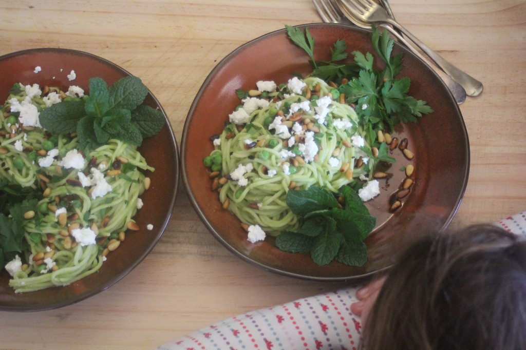 Get one pot of water on the stove, boiling and ready for your pasta. Pour yourself a glass of wine and get on with your pea sauce. Toast some pine nuts, wash your herbs and if you fancy, you could pan fry some prosciutto (if you are one lucky sun-of-a-gun and just so happen to have some in your refrigerator) to snap over the finished dish. We, however, enjoyed this delicious vegetarian version just as laid out for you below and it received a small round of Monday night applause (Hurrah!!!!). I hope, hope, hope that you will be just as happy with it on any given beautiful night of the week xx