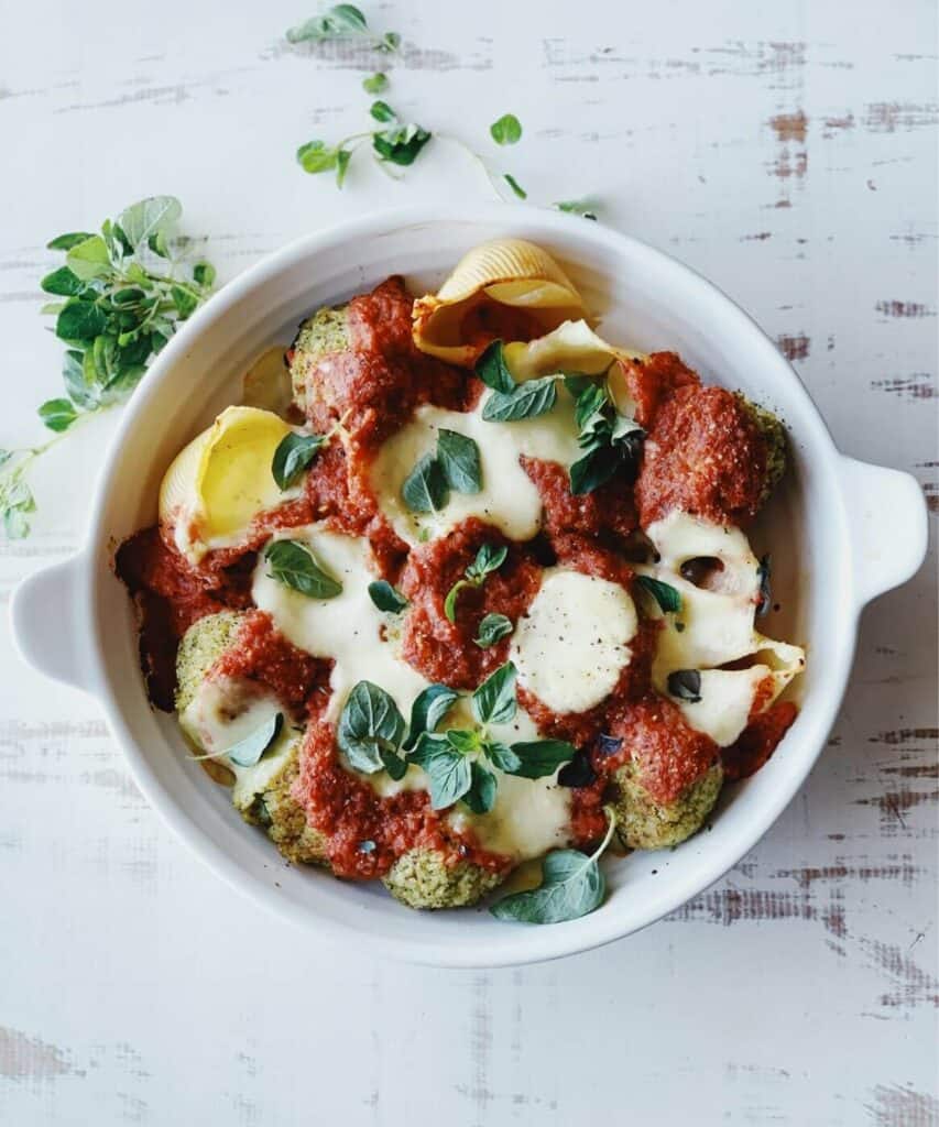 Place the vegetable balls & cooked pasta shells in a baking dish or split across two dishes if you don’t have one big enough.
