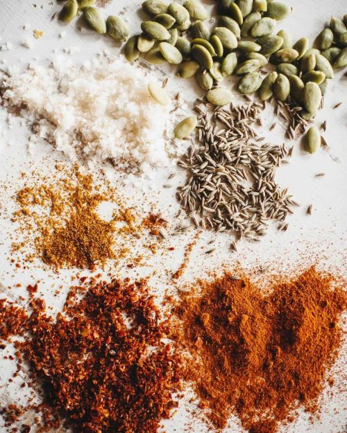 Grind together the toasted cumin and pumpkin seeds in a mortar and pestle, mini food processor or spice grinder.